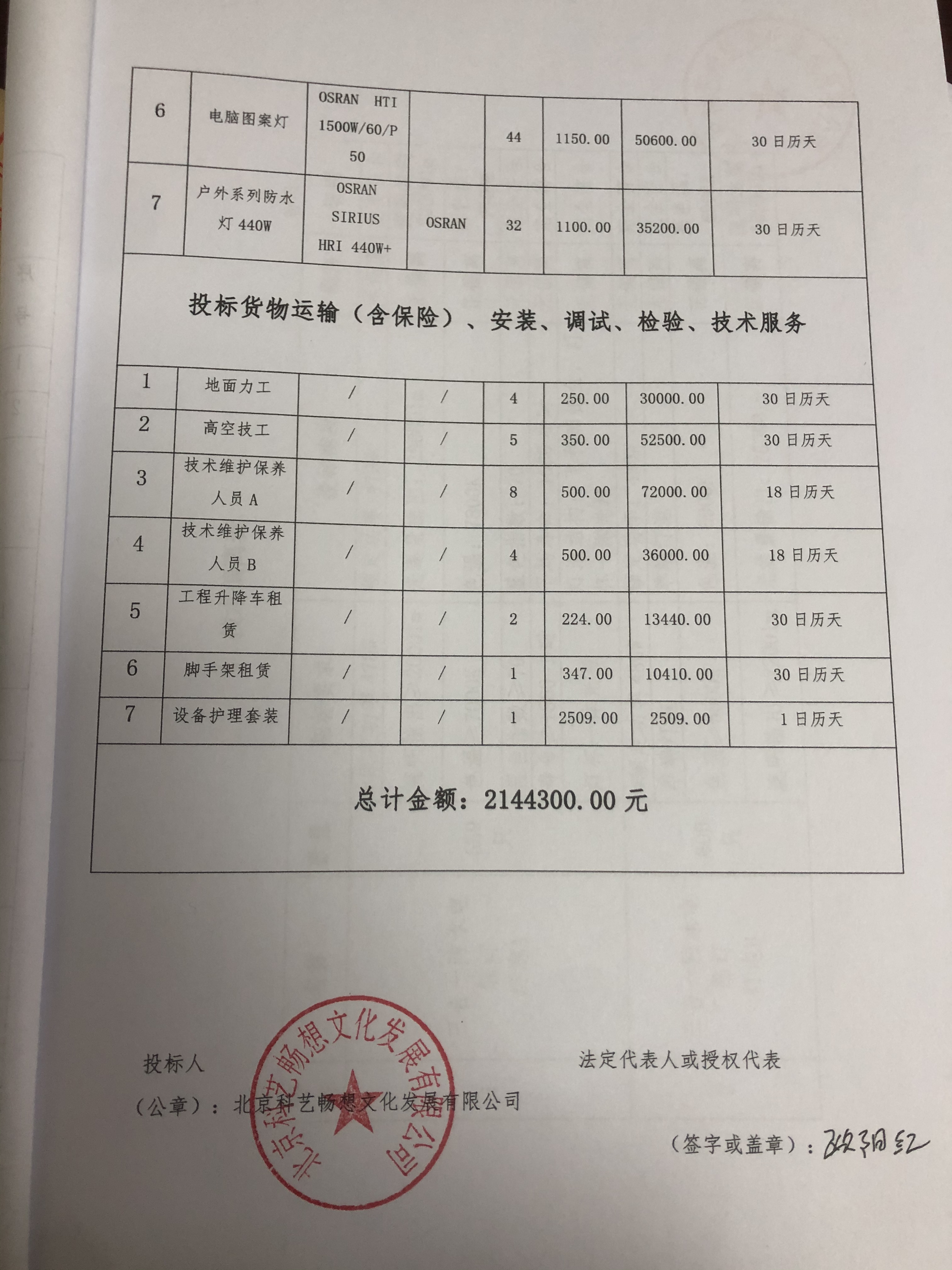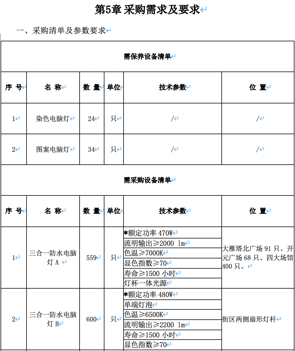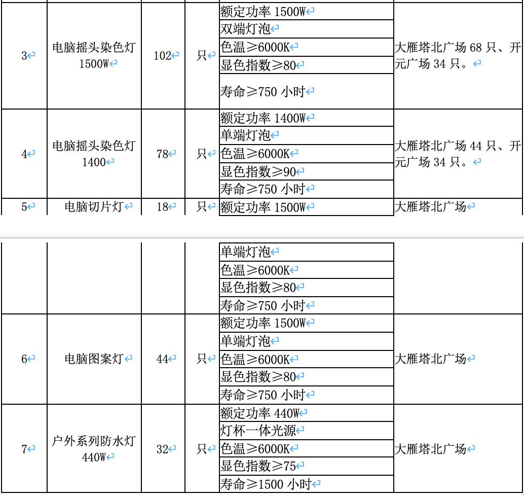 1.灯具配套灯泡需符合国家相关标准及行业标准(如有),对灯具的安全性和基本性能没有影响。 2.灯泡在不同气候环境下长时间使用时,能够具备遇到不同温差时的持续、稳定、安全的性能表现。 3.提供所需电脑灯灯泡安装调试工作,包含施工过程中一切必要措施,确保更换过程中人员及设备的安全性,最终呈现艺术氛围整体效果。 二、供货及安装期限:30日历天。 三、供货地点:大雁塔北广场、开元广场
