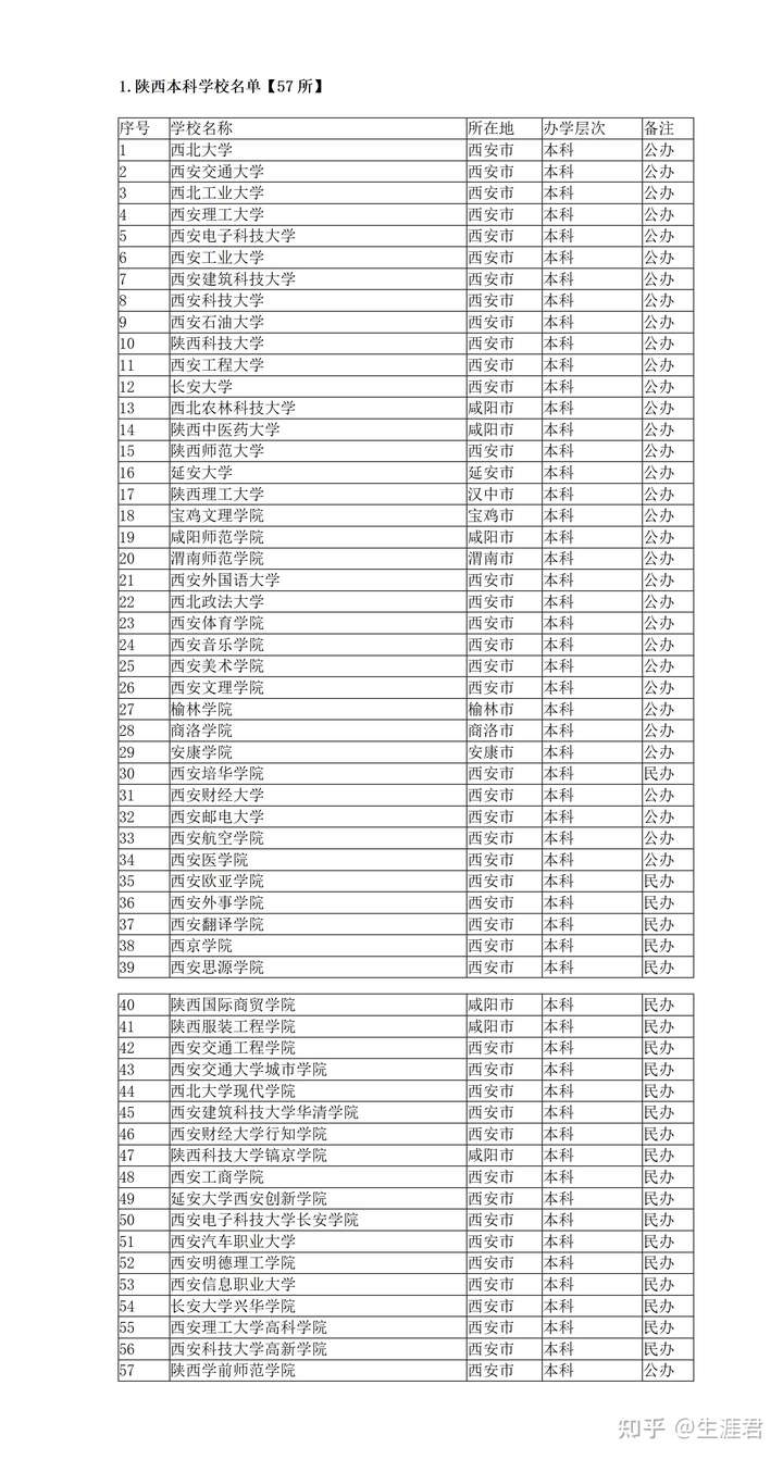 共计96所,其中本科学校57所,专科学校39所 985大学:西安交通大学、西北工业大学、西北农林科技大学。 211大学:西北大学、西安交通大学、西北工业大学、西安电子科技大学、长安大学、西北农林科技大学、陕西师范大学、空军军医大学。 西安交通大学:学校是“七五”“八五”重点建设单位,首批进入国家“211”和“985”工程建设学校。2017年入选国家“双一流”建设名单A类建设高校,8个学科入选一流建设学科。 西安交通大学工程学、材料科学、计算机科学、数学、化学、物理学、药理学和毒理学、地球科学、神经科学和行为科学、生物学与生物化学、临床医学、社会科学、经济学与商学、分子生物与遗传学、环境科学与生态学进入ESI前1%,其中工程学进入前万分之一。