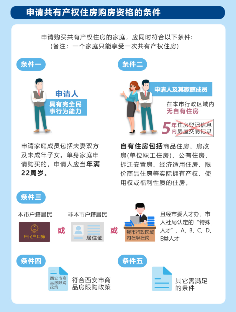 申请办理西安市共有产权房需满足以下条件:   一、申请人应具有完全民事行为能力,配偶及子女以下称家庭成员,单身家庭申请购买的,申请人应当年满22周岁。   二、申请西安市共有产权住房的申请人及家庭成员在本市行政政区域内无自有住房且5年内无住房登记信息和房屋交易记录,自有住房包括商品住房,房改房(单位职工住房) 、公有住房、拆迁安置房、经济适用住房、限价商品房等实际拥有的产权,使用权或福利性质的住房。   三、申请人为本市户籍居民,取得本市居住证的非本市户籍居民或在我市行政区域内在职在岗且经市委人才,市人社局认定的“特殊人才” 、A、B、C、D、E类人才。   四、符合我市住房市场调控管理有关规定。外地户籍家庭迁入本市时间在3月30日及之前的,申请我市共有产权住房“须落户满一年,且在本市连续缴纳12个月的社会保险(或个人所得税)”;非本市户籍的申请人还应提供连续缴纳5年及以上的社会保险或个人所得税缴纳证明;新引进人才的申请人还应提供人才认定证明、在本市行政区域内在职在岗证明。  四、西安共有产权房还能申请吗?   当很多人才开始准备申请的时候,已经有一大批人拿到了资格。   2021年7月29日,西安发布《西安市共有产权住房轮候家庭名单》,将共有产权住房轮候库进行更新,此时申请轮候的家庭数已达34403个。 2022年3月11日,西安市保障性住房管理中心再次公布《西安市共有产权住房轮候家庭名单》,此时申请轮候的家庭数已达41180个。   从上面的拿地信息可以看出,目前的供需失衡,这4.1万个家庭排上共有产权房可能还需要很长一段时间。2022年4月13日,西安住建局回复市民问题,西安2022年共有140亩共有产权房在修建,航空基地40亩、曲江新区78亩、鄠邑区22亩,共可建设约3300套,正在办理前期手续,同时西咸新区64亩共有产权房已开工,可建设1000套。此次临潼项目也会新增房源供应。   另外,西咸新区还有一个共有产权项目,西咸新区的共有产权项目位于案名已确定为星皓和悦,空港国企星皓地产开发建设。是目前进度最快的共有产权房项目,位于底张大街以南、崇文路以东。项目总占地约84亩,总建筑面积约16.5万㎡,规划9栋高层住宅、配套商业及其他6栋楼,同时配建一所幼儿园。   目前是否能申请呢?