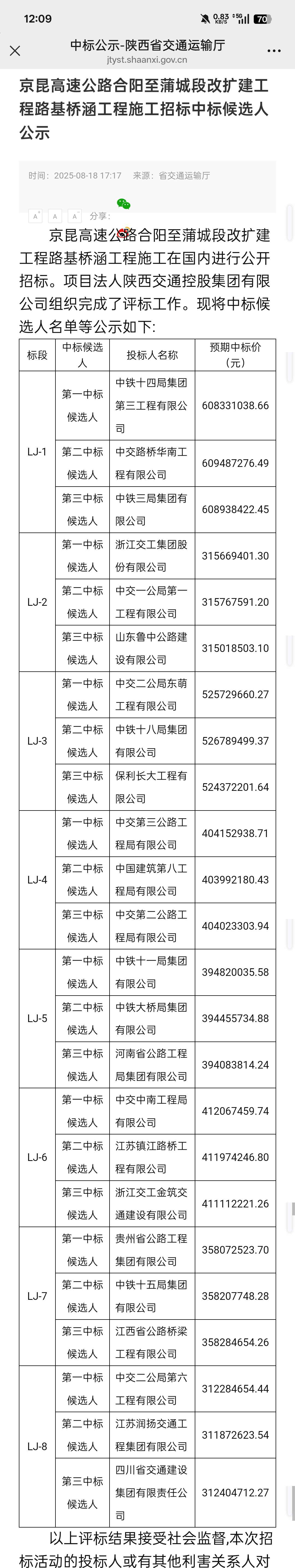[交通] 京昆高速合蒲段改扩建相关工程中标候选人公示
