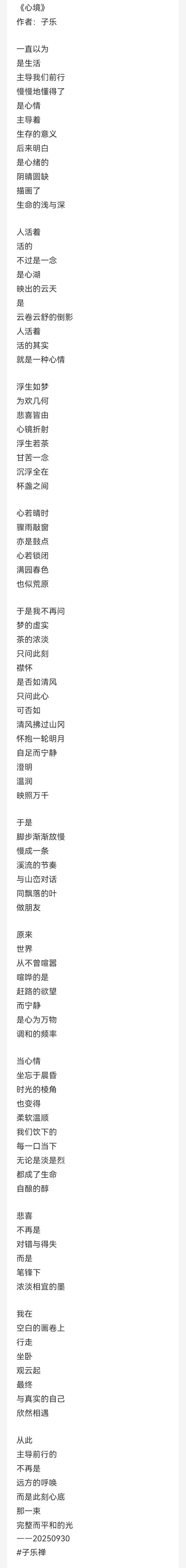 《心境》一诗,既是子乐禅诗美学风格的典型体现,也是一份写给现代人的心灵指南。它用简淡语言构筑了一座连接红尘与诗意、喧嚣与宁静的桥梁,提醒我们:真正的自由不在远方,而在每一次呼吸间对心念的觉察与调和。