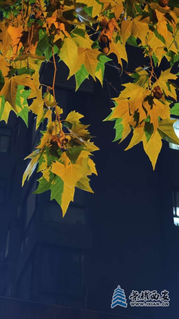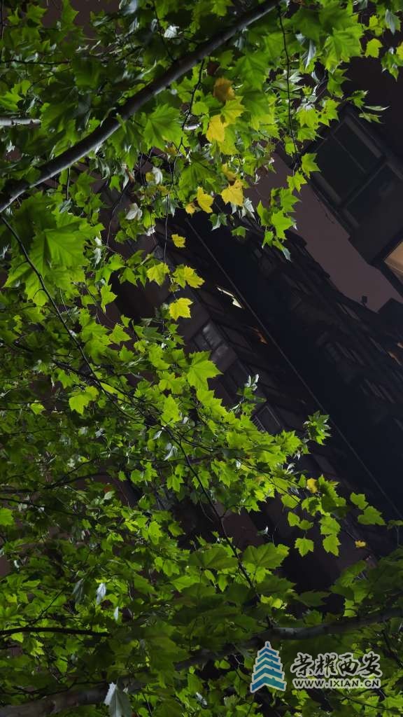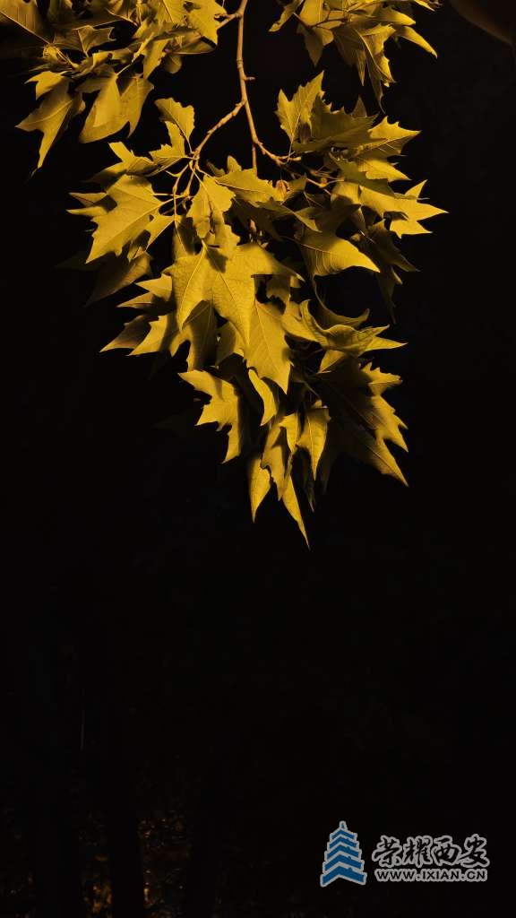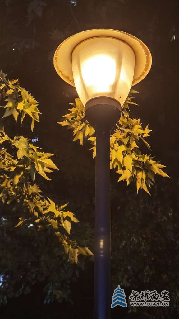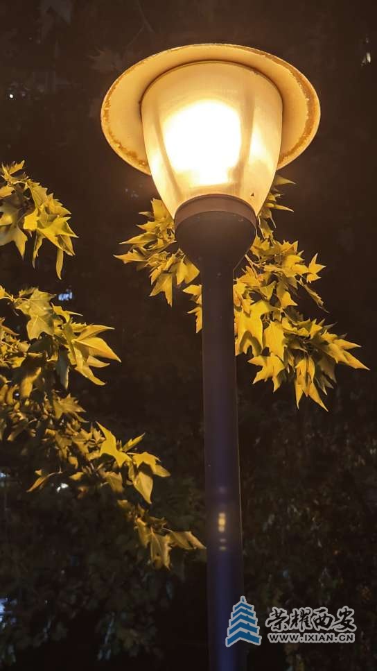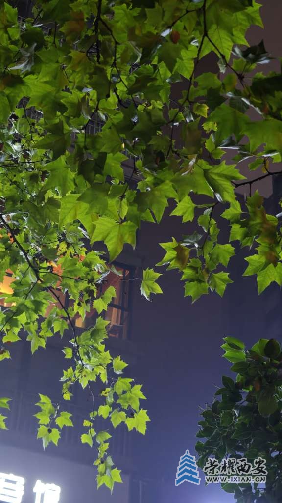 夜间的路灯把树叶照得通体发亮。