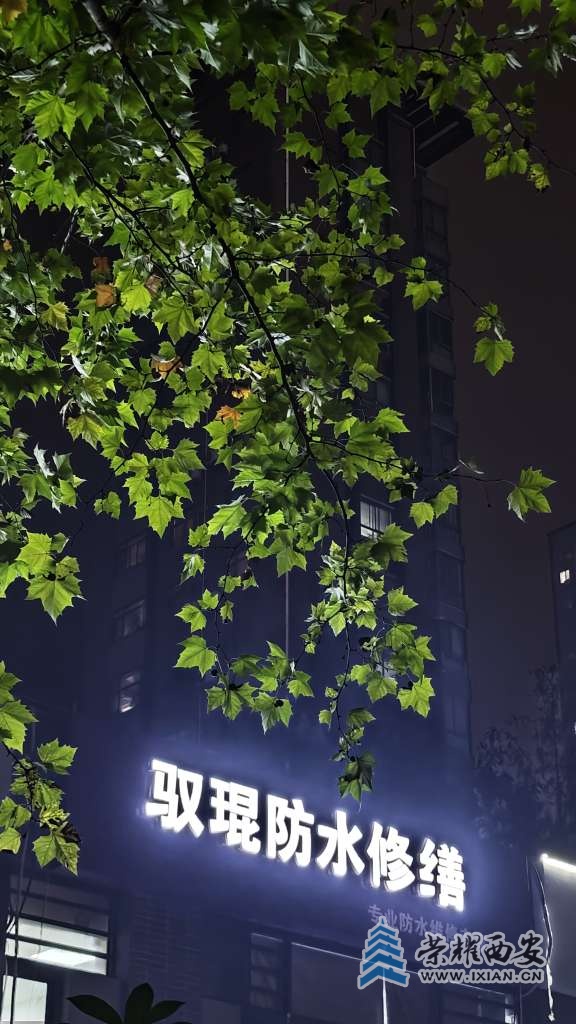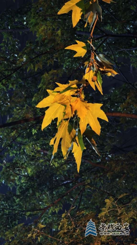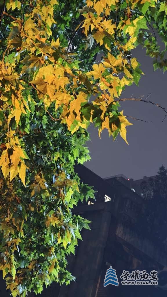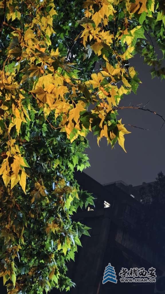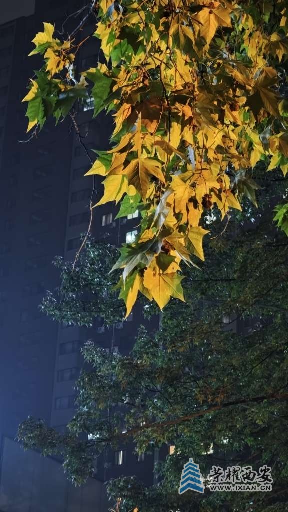 夜间的路灯把树叶照得通体发亮。