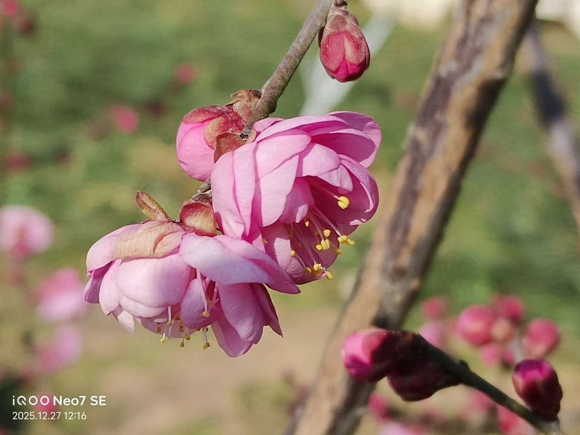 踏入植物园,一股清幽的香气扑鼻而来,那香气淡雅而悠远,像是被风揉碎在空气里,引得我循着它的踪迹一路探寻。远远望去,一片粉的、红的、白的色彩在冬日的萧瑟中显得格外夺目,宛如一幅绚丽的画卷在眼前徐徐展开。