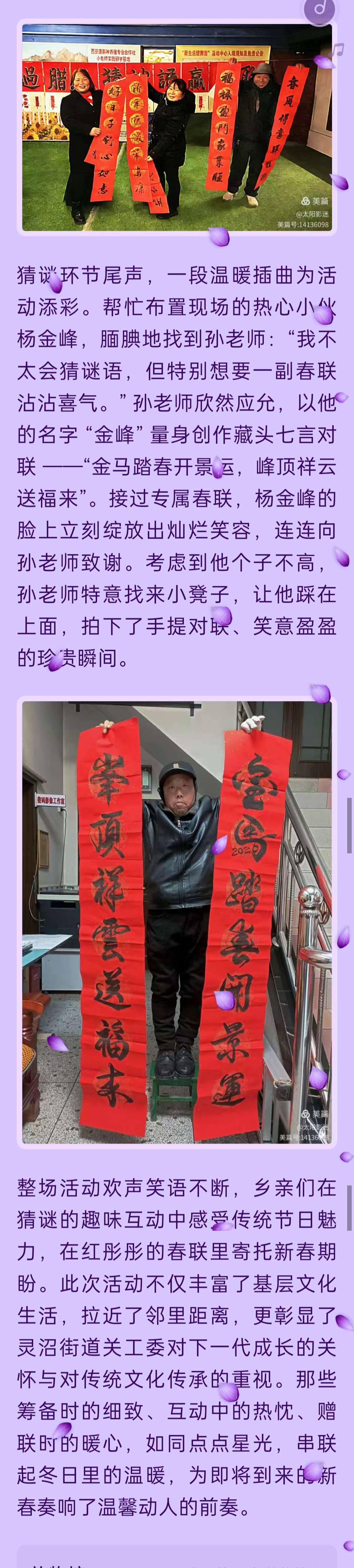 1 月 26 日晚上(腊八当天),由灵沼街道关心下一代工作委员会、五老活动中心主办的 “过腊八 猜谜语 赢春联” 喜乐会,在灵沼回鹤文化大院热闹启幕。