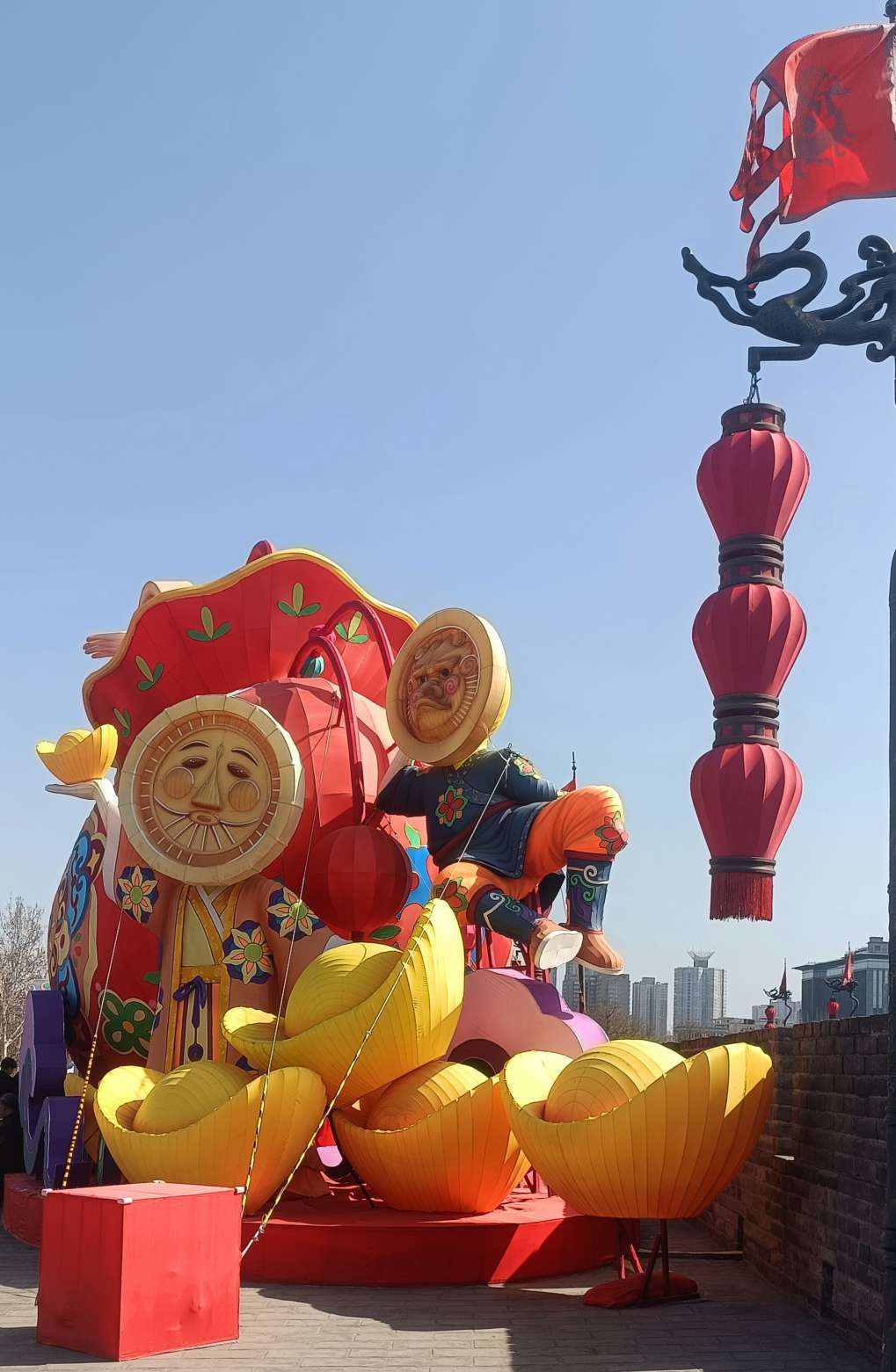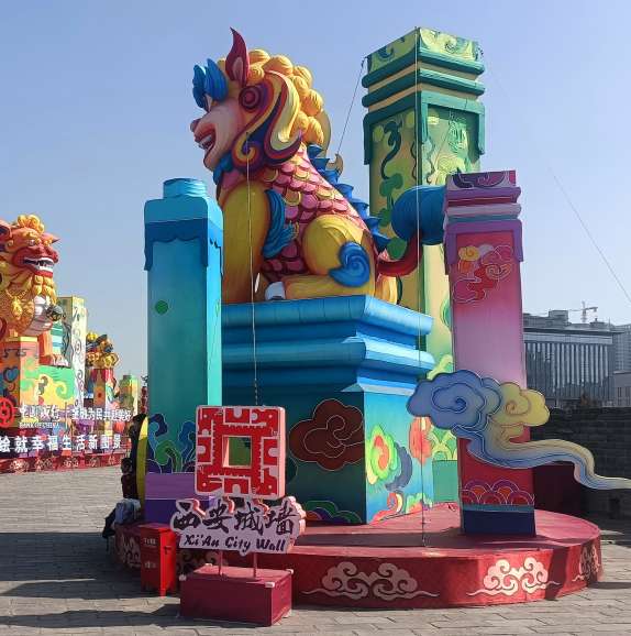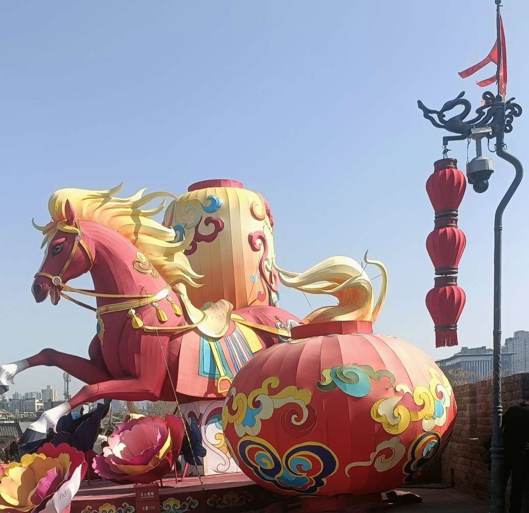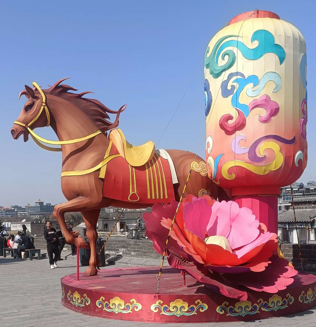 登上城墙,长安灯会的璀璨盛景映入眼帘。灯展以马造型为主,宝葫芦、唐代文银壶等元素巧妙融合,独特设计,部分灯组带有民族风格,多元又绚丽。