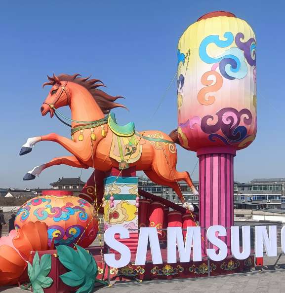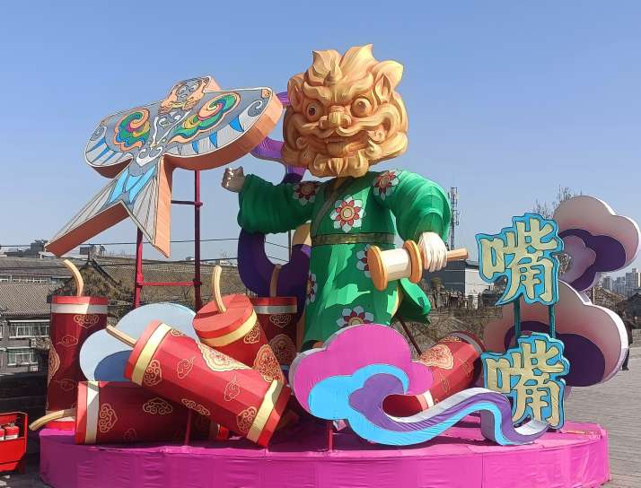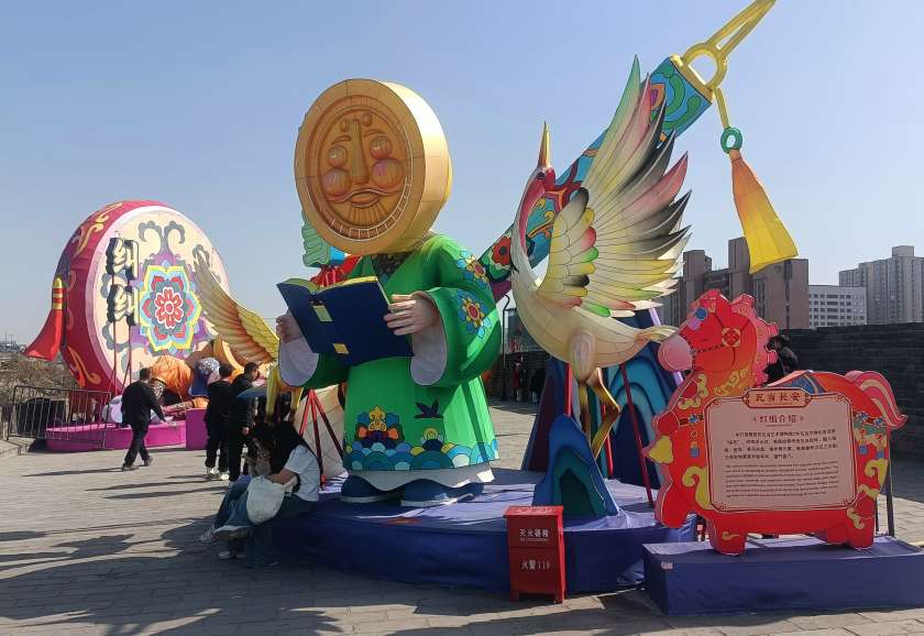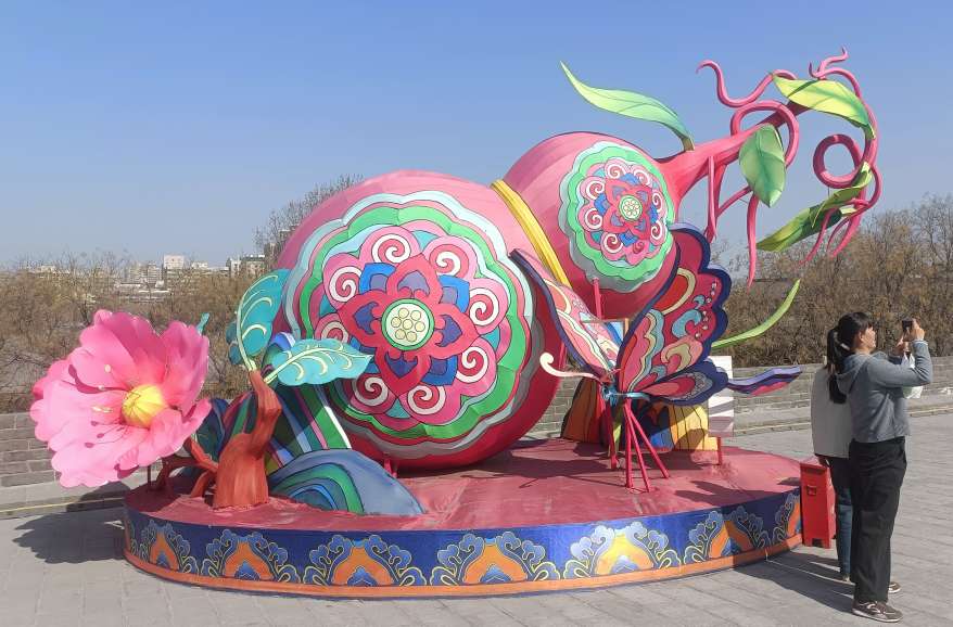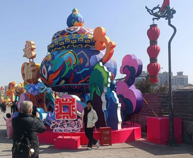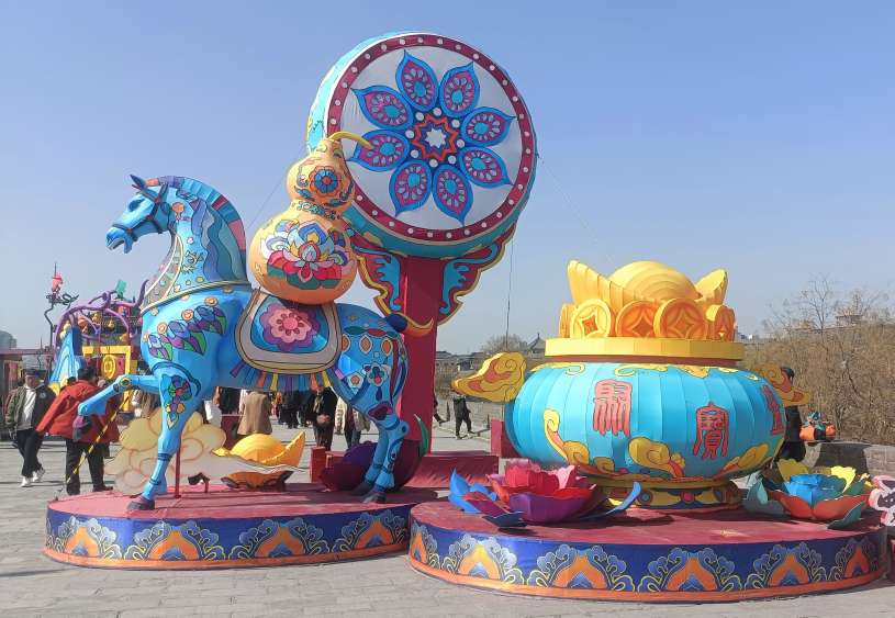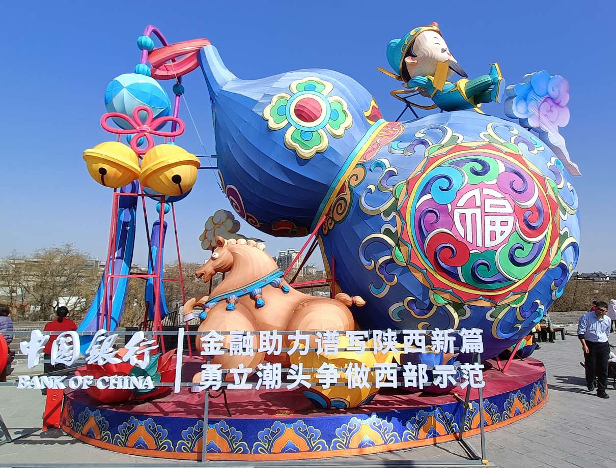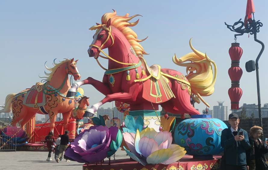 登上城墙,长安灯会的璀璨盛景映入眼帘。灯展以马造型为主,宝葫芦、唐代文银壶等元素巧妙融合,独特设计,部分灯组带有民族风格,多元又绚丽。
