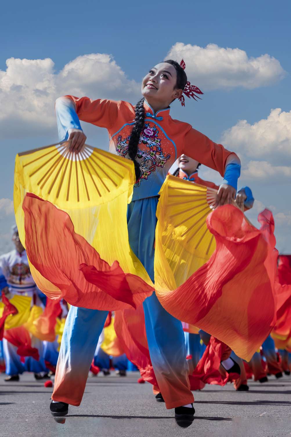 11点仪式开始,在新市区子长路两边挤满了人。这时太阳也出来了,久违的蓝天白云也显现。我一屁股坐在主席台的路上,期间警察还不停的喊着后退后退,我就不停的屁股朝后挪,好在我一直在第一排C位。这一屁股坐在马路上就3个半小时。